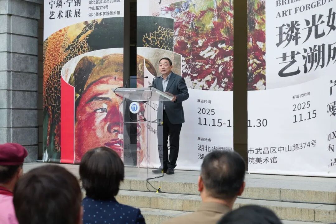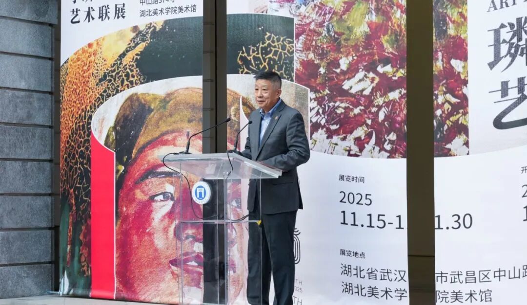 武汉理工大学艺术与设计学院名誉院长陈汗青教授,对湖北美术学院建校105周年及此次展览开幕表示祝贺。他回顾了从武昌芝麻岭的初创校舍到今日藏龙岛的现代化校园,湖北美术学院105年的发展轨迹,正是一部中国现代美术教育的演进史。一代代湖美人以画笔为媒,以美育为魂,在荆楚大地上深耕艺术沃土,铸就了“推行美育,启发民智”的精神丰碑。“璘光如玉·艺溯成钢”,这不仅是一场父子两代人的艺术对话,更是一次跨越时空的精神传承。它向我们昭示:艺术的生机,源于传承中的创新,创新中的坚守。